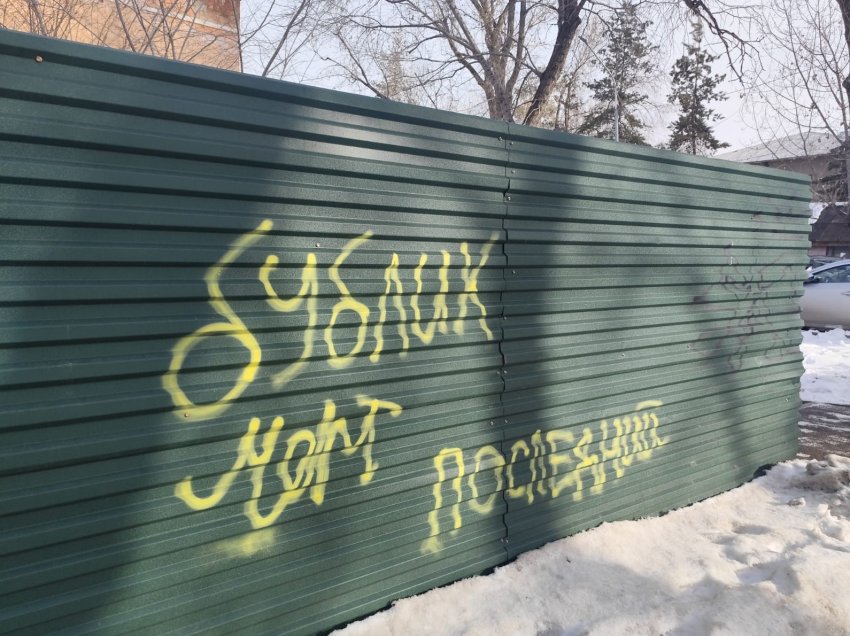 Пока дальнейшая судьба многострадальной железнодорожной больницы решается на высоком уровне, на металлических щитах, из которых сложено заграждение, появляются различные надписи (как смешные, так и не очень).