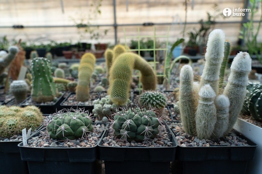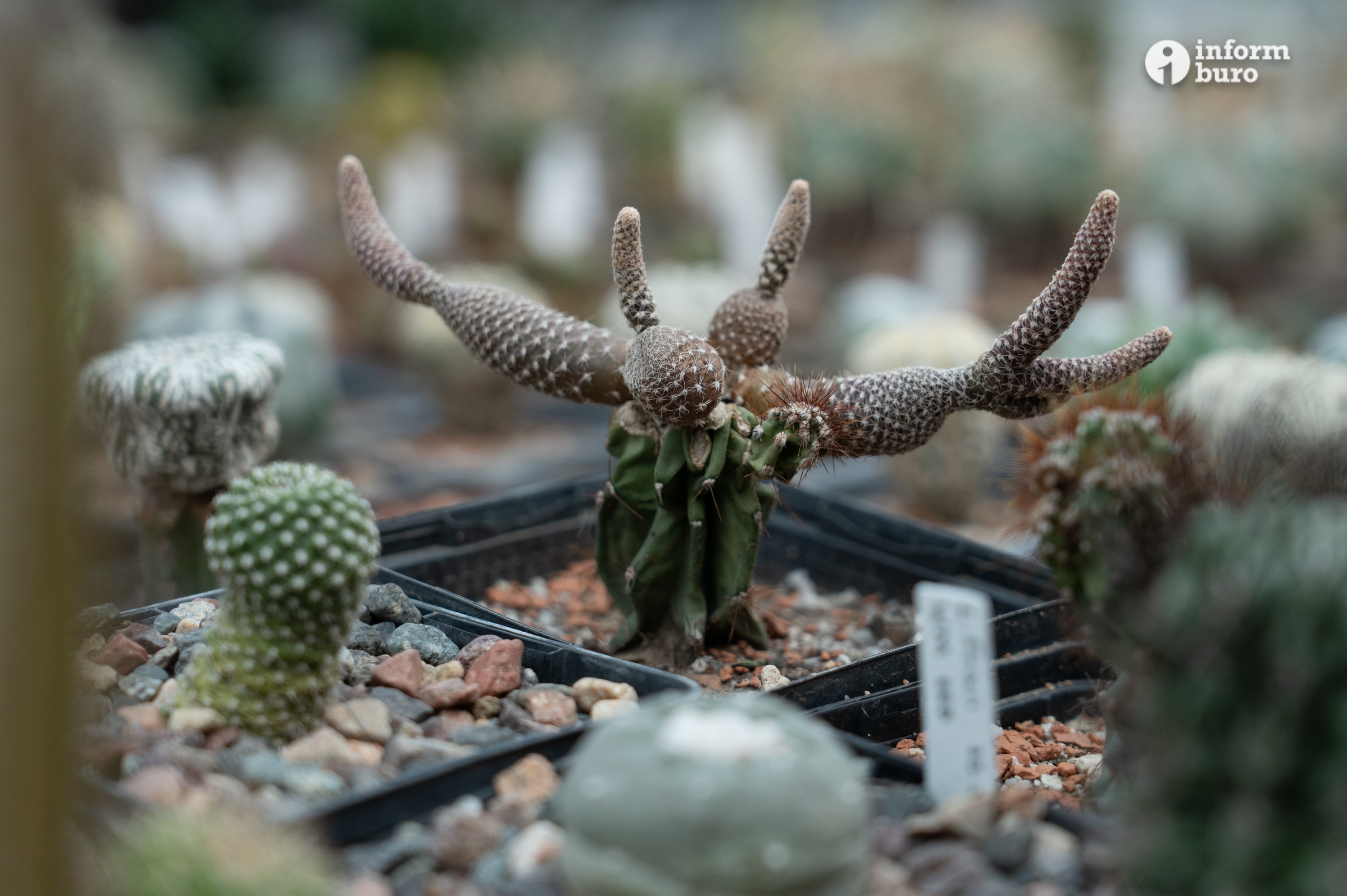 Внушительную коллекцию кактусов разместили на огромных столах. Не все виды имеют колючки. Удивительно выглядят литопсы. Представители рода суккулентных растений семейства аизовых неслучайно называют живыми камнями. Они произрастают в песчаных и каменистых пустынях Намибии, ЮАР и Ботсваны.