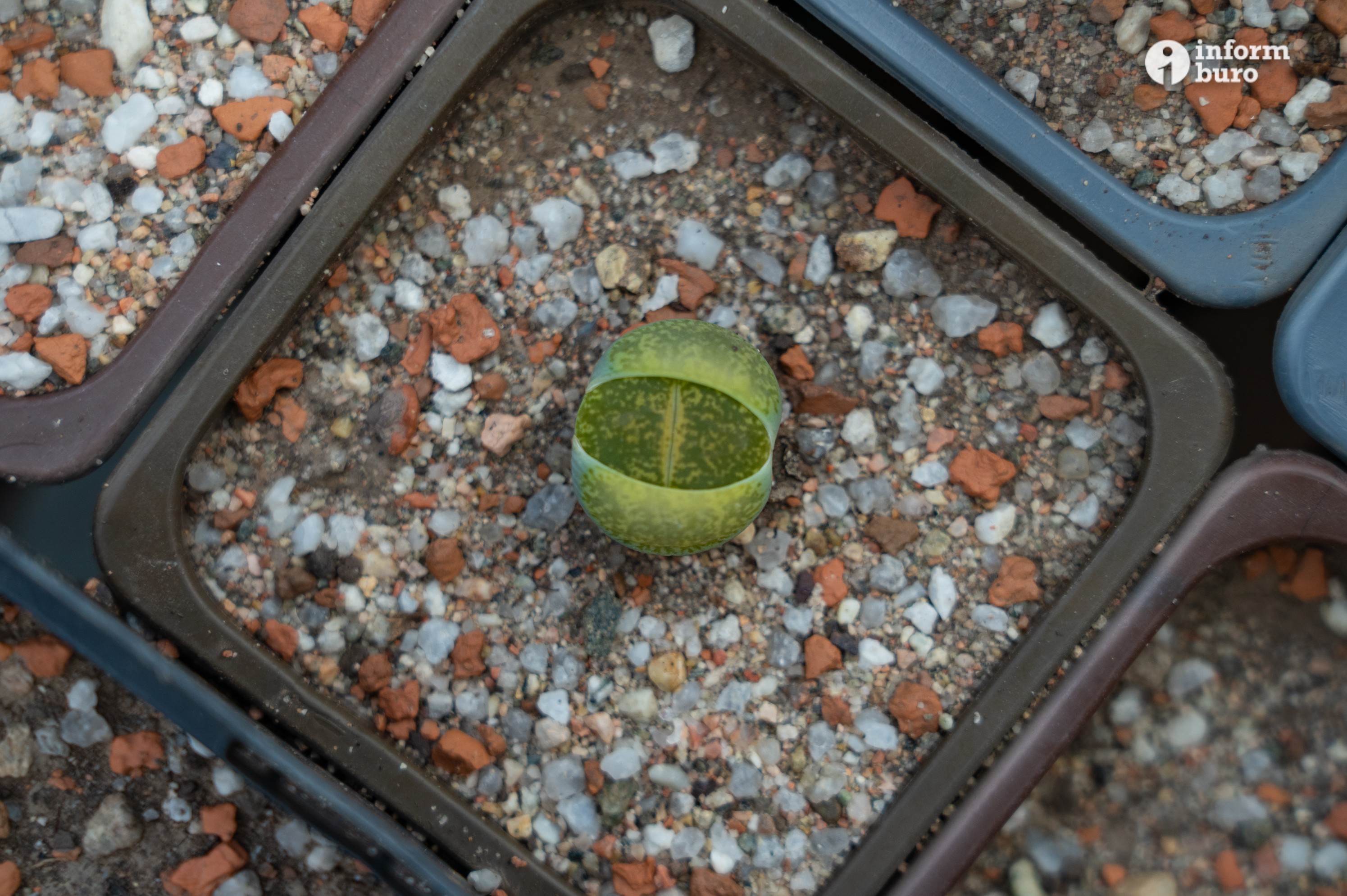 По соседству с литопсами находятся крохотные горшочки с лофофорами, а также с кактусами с мягкими иголками и яркими цветами.