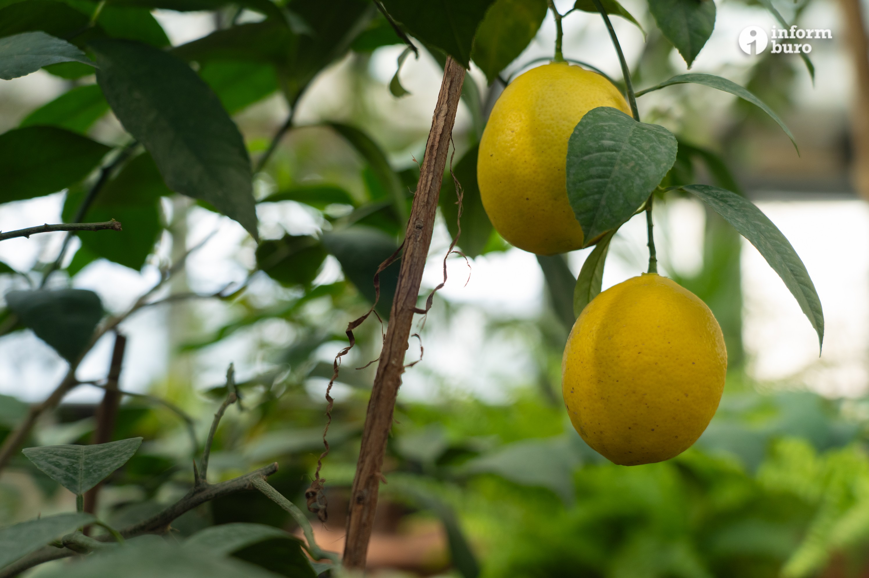 В теплице цитрусовых зелёным обитателям тоже пришлось потесниться. Везде и всюду стоят горшки с экзотическими деревьями. В теплице, несмотря на влажность, явно ощущается аромат цветения. Ветви деревьев щедро покрыты цветами, дополняют восхитительную картину жёлтые плоды лимонов.